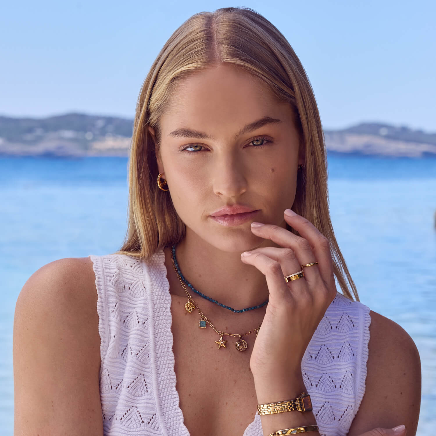 Laidback meets luxe in this semi-precious stone necklace. Known for its energising properties, each blue apatite bead is thought to bring confidence, focus, and fresh perspective. Strung with gold-plated accents and finished with our signature shine, it adds a beachy ease to your everyday look – whether layered up or worn solo.